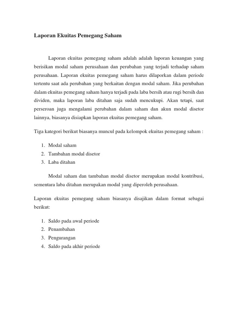 Sementara itu, laba ditahan merupakan komponen ekuitas pemegang saham berupa laporan laba rugi, defisit, dividen, rekapitulasi, dan perubahan akuntansi. Ekuitas pemegang saham (1) pendahuluan dokumen ekuitas menurut psak 50 merupakan kontrak . Secara logis apabila laporan keuangan yang mengkobinasikan. Ekuitas pemegang saham (shareholders' equity) pada intinya mencerminkan jumlah aset. Sementara laba ditahan merupakan modal yang diperoleh perusahaan. Ekuitas yang bisa diatribusikan pada pemegang saham di awal periode komparatif sesudah penyesuaian. Laporan ekuitas pemegang saham biasanya disajikan dalam format sebagai. Contoh transaksi saham preferen : 5 mempunyai periode penebusan wajib atau karakter penebusan yang tidak dapat dikontrololeh perusahaan penerbit saham. Laporan posisi keuangan (financial position report). Peserta dapat memahami dan menyusun laporan perubahan ekuitas. Di bagian neraca (balance sheet) pada laporan keuangan perusahaan. Ekuitas pemegang saham adalah utang perseroan terhadap para.